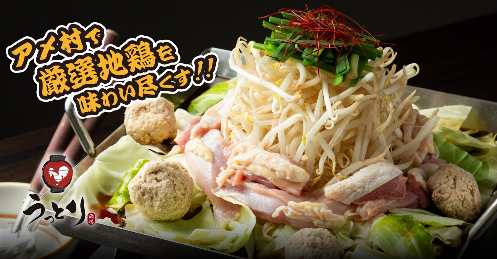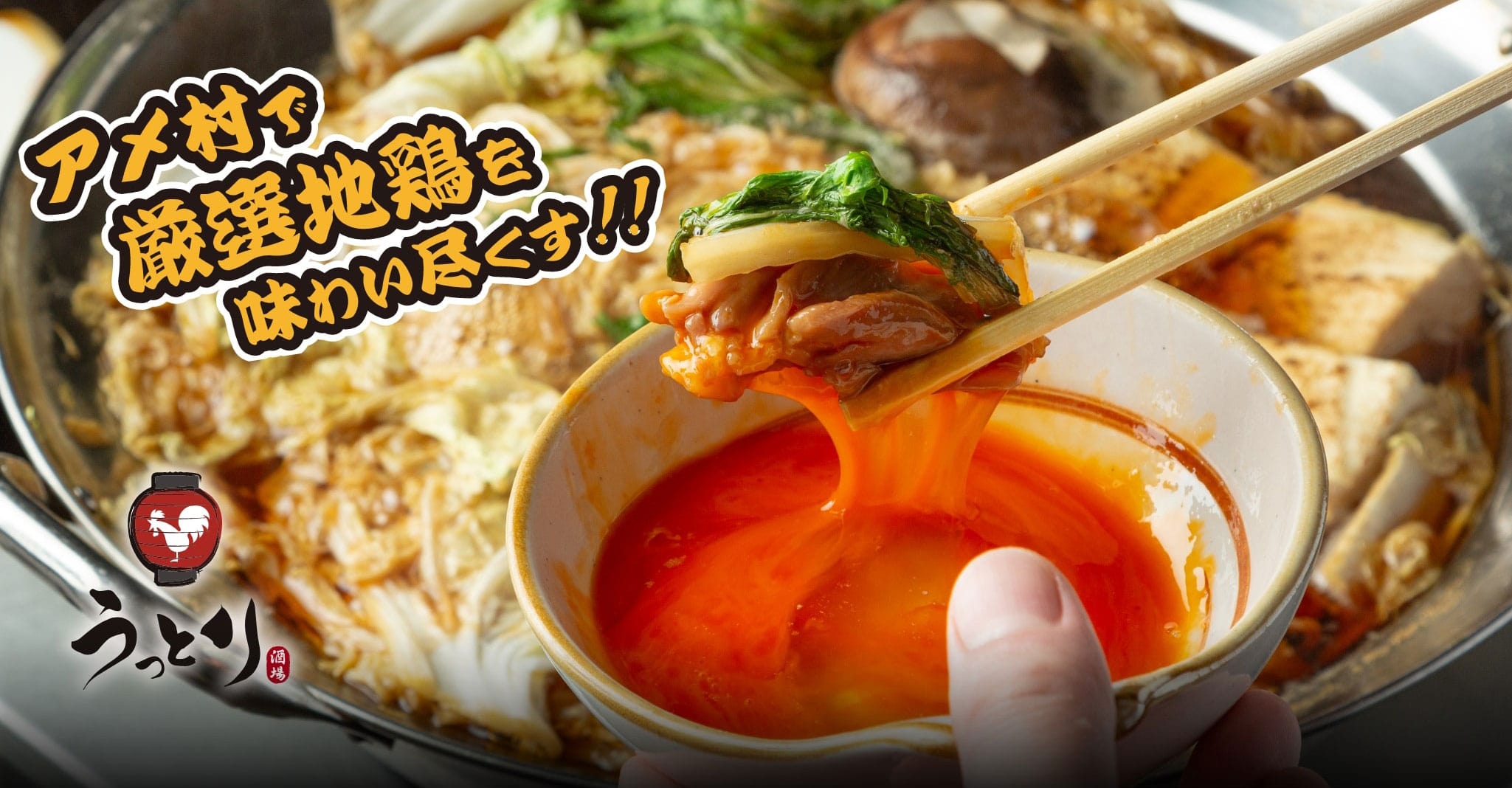 大阪難波・道頓堀にある鶏料理店「うっとり酒場 アメ村店」では、「地鶏すき焼き鍋」「旨出汁とりしゃぶしゃぶ」「地鶏ちりとり鍋」の3種類のお鍋がおすすめです。他にも鶏のお刺身や串、揚げ物などさまざまな鶏料理をご提供しております。